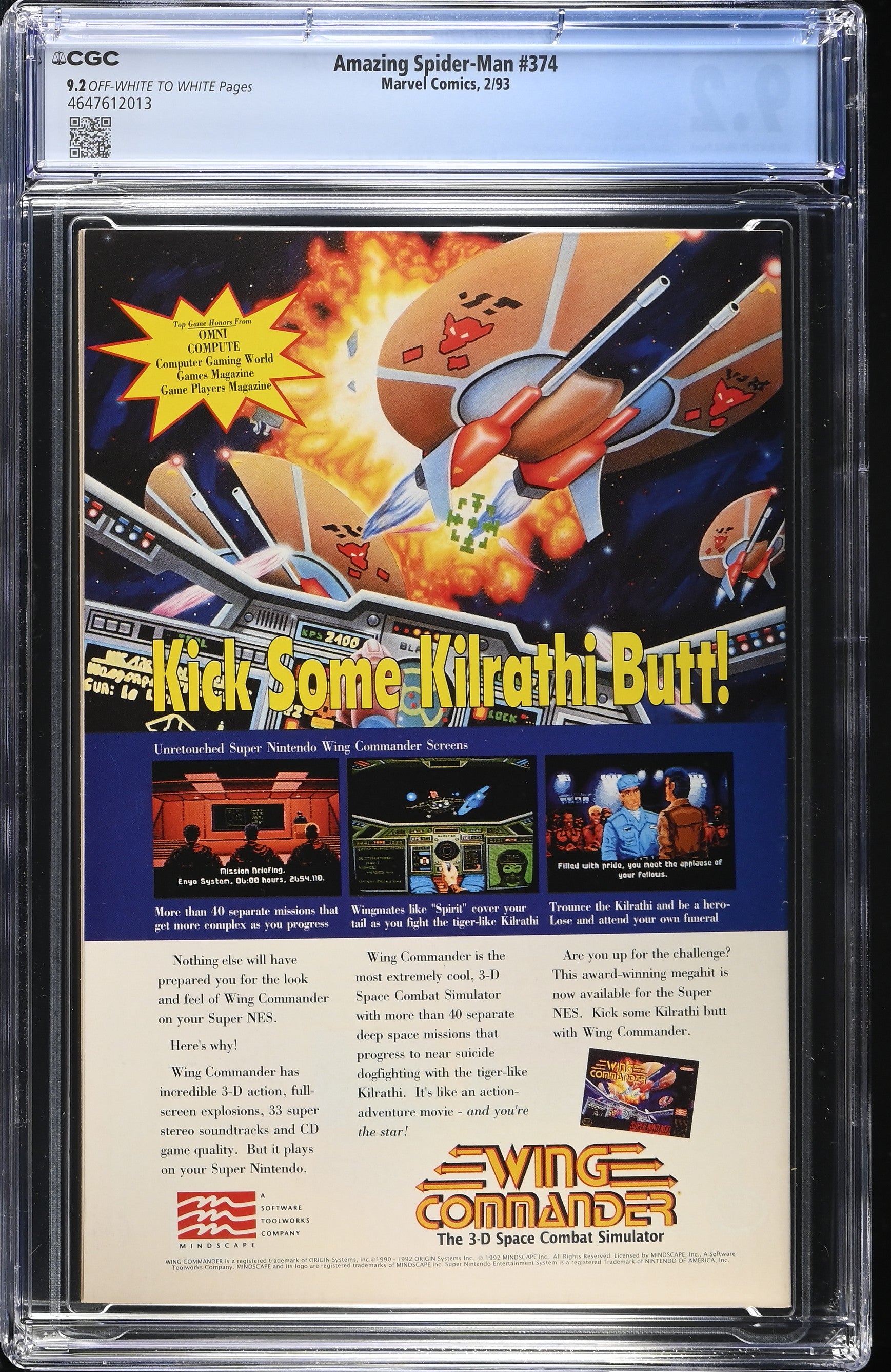 The product is a highly collectible comic book, Amazing Spider-Man #374, published by Marvel Comics in 1993 during the Modern Age era. This single issue features an early appearance of Venom, adding to its appeal for fans of superheroes and action-packed stories. Professionally graded by Certified Guaranty Company (CGC) as 9.2, this comic book is a valuable addition to any comic book enthusiast's collection.