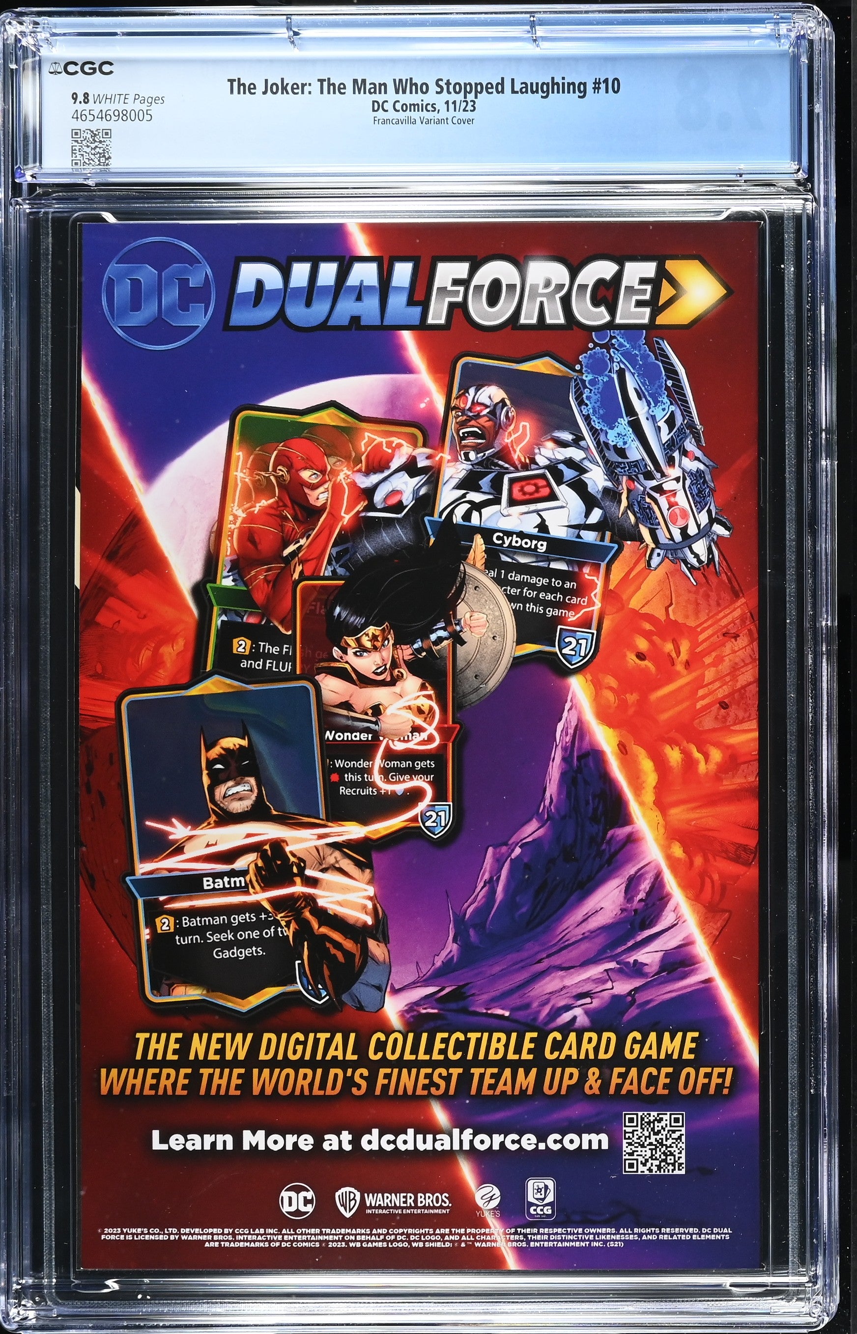 The product is a highly collectible comic book titled "The Joker: The Man Who Stopped Laughing" issue #10, published by DC Comics in 2023. This particular variant cover features artwork by Francesco Francavilla, graded at 9.8 Near Mint/Mint by Certified Guaranty Company (CGC). The comic falls under the genre of comics and is written in English, catering to a US Comics tradition with a modern age style. It is a single issue format that is perfect for any fan of the Joker character and collector of comic books.