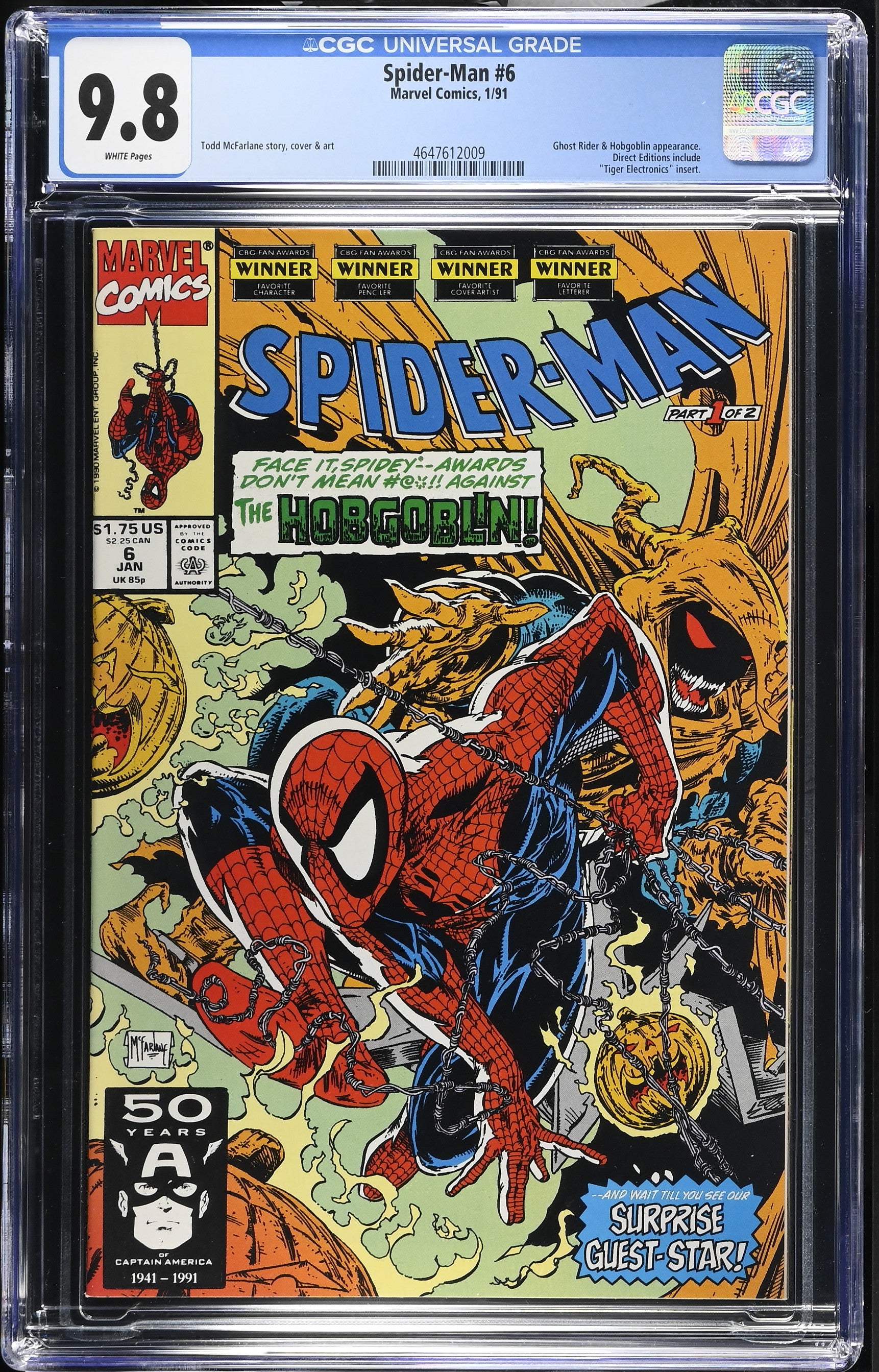 The product is a highly collectible Spider-Man comic book issue #6 from January 1991, graded a perfect 9.8 Near Mint/Mint by Certified Guaranty Company (CGC). This single issue features popular characters like Spider-Man (Peter Parker), Mary Jane Watson-Parker, and the villain Hobgoblin (Jason Macendale Jr.), along with the character Ghost Rider (Danny Ketch). With stunning cover art by Todd McFarlane and a direct edition feature, this comic from the Copper Age of US Comics is a must-have for any comic book enthusiast or collector of superhero memorabilia.