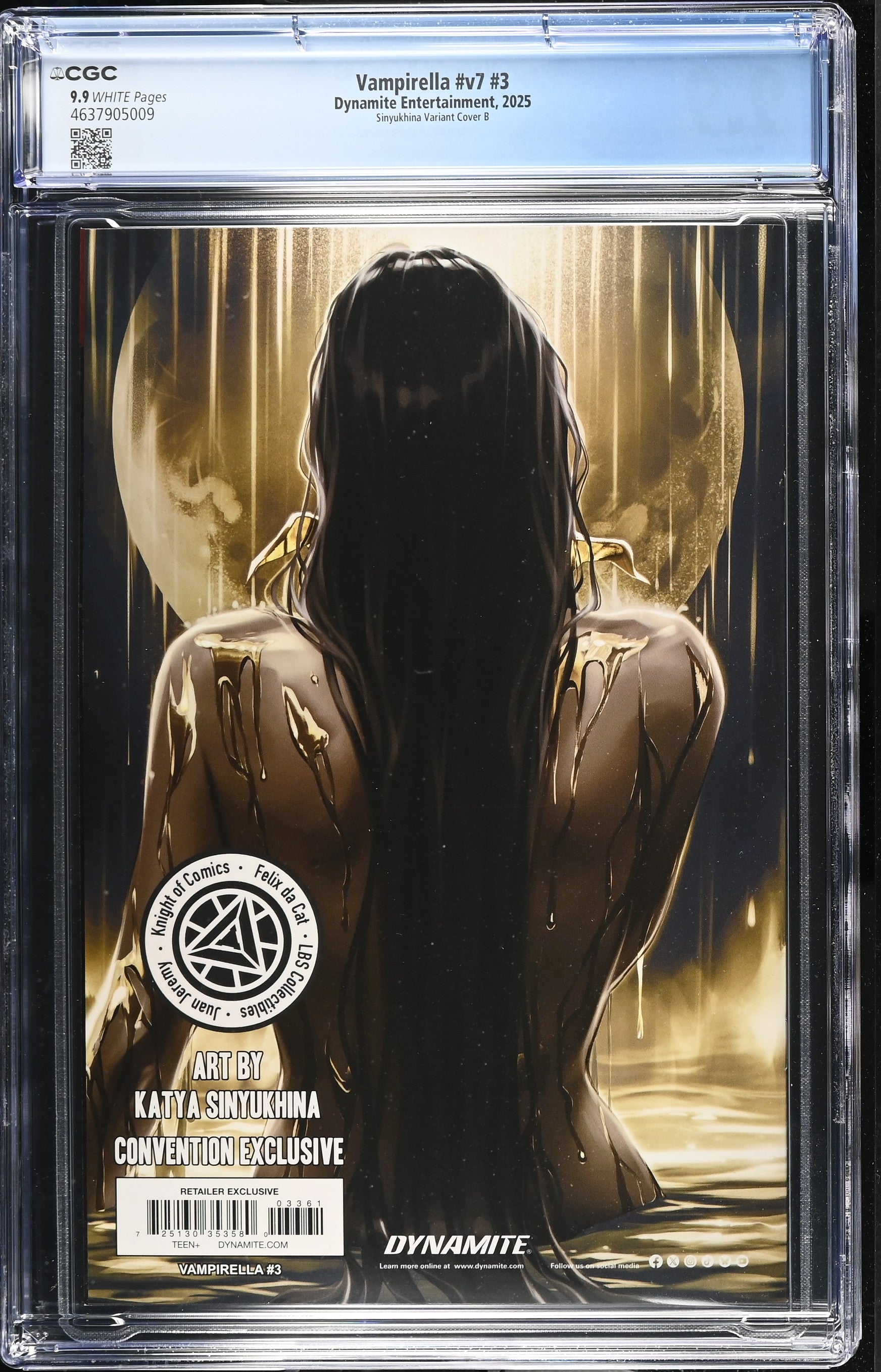 The product is a highly collectible and sought-after comic book, VAMPIRELLA #3, featuring a stunning gold moon wraparound cover by artist Katya Sinyukhina. This particular variant cover is known as a "Virgin Variant" and is graded at a near-perfect 9.9 Mint by CGC. The comic, published by Dynamite Entertainment in 2025, is part of the modern-era series and is intended for general audiences. With its unique cover and character design, this comic is a must-have for fans of the Vampirella universe and comic book collectors alike.