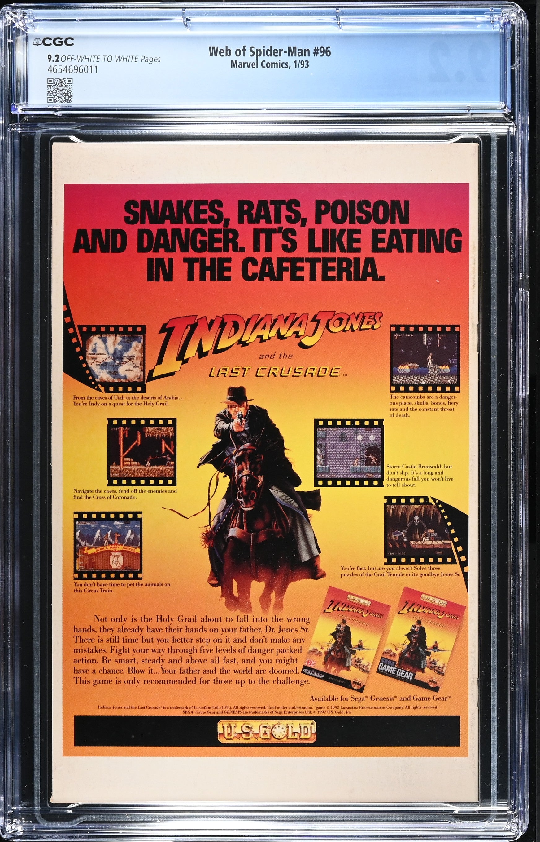 The product is a single issue comic book titled "Web of Spider-Man #96" published in 1993 during the Modern Age era of US Comics. The story likely features the character Spider-Man in an action-packed superhero adventure. With a CGC grade of 9.2 Near Mint-, this collectible comic book is a prized possession for fans of the Spider-Man series and comic book collectors alike.